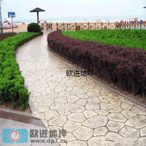 澆筑壓膜混凝土施工——壓膜混凝土施工初凝時(shí)撒布彩色滲透強(qiáng)化干粉(壓膜粉),并使之抹平——撒布彩色脫模粉——模具壓花——除去脫模粉——養(yǎng)護(hù)——封閉劑(界面劑)——密封保護(hù)