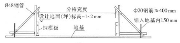 布網(wǎng)鋼筋采用膨脹螈栓焊接法,并按設(shè)計(jì)比例規(guī)格沿棍寧圖澆灌方向排列,實(shí)現(xiàn)基層穩(wěn)固高度固定,減少后期開裂,之后采用線繩矯正鋼筋的水平高度和水平直度。在混凝土支模的過程中,用粘玻璃條替代鋼模板,在地幔厚度較大的情況下,使用通條固定。其只設(shè)方法如圖2。