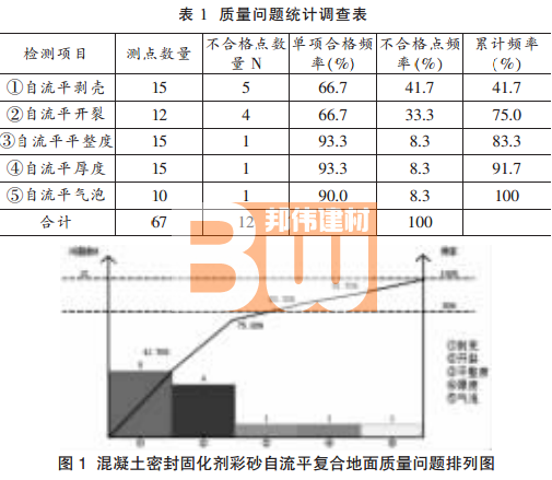 通過混凝土密封固化劑彩砂自流平復(fù)合地面質(zhì)量問題排列圖分析,自流平剝殼、開裂為影響整個混凝土密封固化劑彩砂自流平復(fù)合地面質(zhì)量的主要問題,累計頻率達到 75.0%。