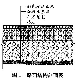彩色水泥人行道路面施工過程中對地基、墊層處理與普通水泥路面的施工工藝要求相同,要求基層和墊層有足夠的剛度、滿足防凍脹、有能防止產(chǎn)生唧泥所需要的厚度、寬度應(yīng)大于路面面層寬度等要求(見圖1)。在混凝土基層施工中,要根據(jù)不同人行道是否上車的要求,區(qū)分不同的用途,設(shè)定不同的厚度和強(qiáng)度。彩色水泥面層的施工要在混凝土基層初凝后進(jìn)行,厚度在l cm~2 cm之間?;炷粱鶎雍筒噬嗝鎸拥氖┕ひ眯⌒蜋C(jī)具攤鋪和振實(shí)。