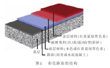 路面的彩色防滑處理技術(shù)主要是指通過采用高性能的雙組分丙烯酸樹脂,將混合選定的高耐磨值的防滑骨料鋪設(shè)于道路表面,使之與基材完好地結(jié)合在一起,在保證極佳的附著力、高耐磨強(qiáng)度的前提下,大大提高了路面的防滑值(SRT60以上),最終減少因道路表面光滑而造成的事故,并縮短剎車距離。彩色防滑路面的結(jié)構(gòu)見圖1。
