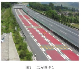 隧道的出入口:里外各延伸50m,滿鋪方法,在隧道入口處,增加兩組間隔線收費(fèi)站的減速帶:采用三根1m寬,間隔5m為一組,每組間隔11m的三組間隔線,見圖3。
