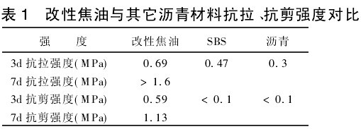(1)改性焦油(比例1)與其它瀝青材料抗拉、抗剪強(qiáng)度對(duì)比,結(jié)果見(jiàn)表1。