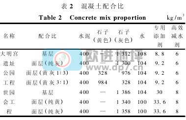 2.2.2世園會工程特點1)面層石子分純黃和純灰兩種,其中黃色石子與大明宮遺址公園石子產地相同,質軟易碎。2)長安花谷內廣場鋪裝面積不規(guī)則,個別地方不能使用平板振動器,增加了底料振實施工難度。3)世園會工程屬冬季施工,氣候因素對外加劑摻量、混凝土鋪裝及沖洗時間影響很大,施工過程中需采取保溫措施。