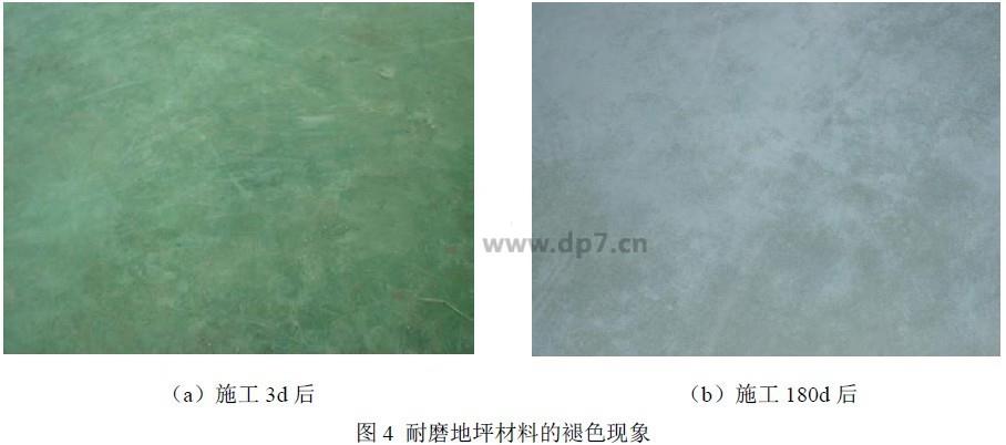 水泥基耐磨地坪的一大優(yōu)勢是可以根據(jù)客戶需求,通過改變顏料種類及摻量,得到不同顏色的耐磨地坪。然而,由于很多有機類顏料耐堿耐候性較差,從而導致地坪在使用過程中發(fā)生褪色現(xiàn)象,如圖4 所示。