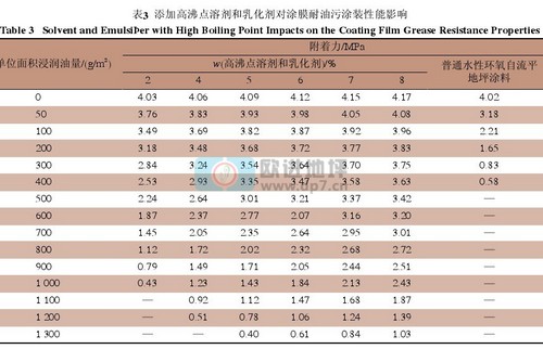本文在普通水性環(huán)氧自流平地坪涂料的基礎(chǔ)上,通過添加合適及適量的高沸點溶劑、納米氧化鋁和乳化劑,使其具有優(yōu)異的耐油污涂裝、耐磨性能。