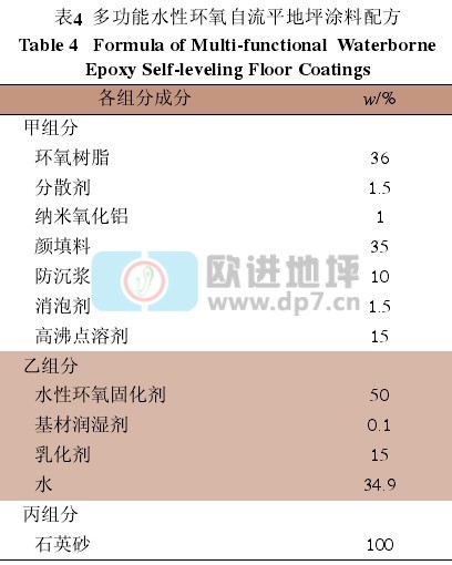 通過大量的試驗研究,研制出了多功能水性環(huán)氧自流平地坪涂料,其配方見表4。