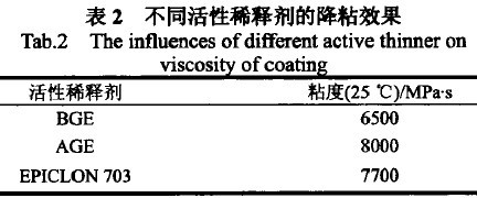 常用的活性稀釋劑主要有AGE、BGE,它們均為低分子質(zhì)量環(huán)氧化合物,較易揮發(fā)、氣味濃、毒性較大,不符合日益增長(zhǎng)的環(huán)保要求。EPICLON 703為C12.C14烷基縮水甘油醚,沸點(diǎn)高達(dá)107℃,不易揮發(fā),極低的氣味,毒性低,具有優(yōu)異的顏填料潤(rùn)濕能力,是一種環(huán)保型環(huán)氧活性稀釋劑。不同的活性稀釋劑對(duì)漆料的降粘效果不一樣。保持其它條件不變,分別采用BGE、AGE和EPIcLON 703制漆,測(cè)定它們的粘度,以觀察不同活性稀釋劑的降粘效果。粘度測(cè)試結(jié)果見表2。