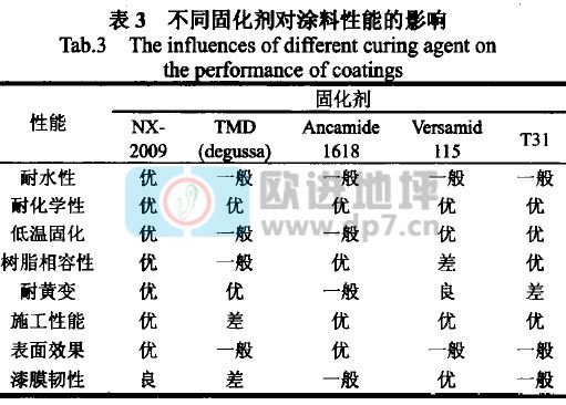 環(huán)氧樹脂本身是一種熱塑性高分子,單純的環(huán)氧樹脂本身并沒有多大的價(jià)值,只有加入固化劑使它轉(zhuǎn)變?yōu)槿S網(wǎng)狀立體結(jié)構(gòu),才能呈現(xiàn)其優(yōu)異的性能。目前無溶劑自流平地坪涂料使用的主要固化劑有脂肪胺及其加成物、脂環(huán)胺及其加成物、聚酰胺及其加成物、酚醛胺等。通常選用的固化劑中應(yīng)該含有抗白花、耐酸、低溫固化(5~10℃)、耐黃變、抗水斑的成分,以避免無溶劑環(huán)氧自流平地坪涂料在低溫、高濕的環(huán)境下施工可能出現(xiàn)的油斑和白花現(xiàn)象,因此固化劑的選擇至關(guān)重要。試驗(yàn)中采用了五種固化劑,分別與同一色漆搭配制備涂膜,觀察了它們對(duì)涂膜性能的影響,結(jié)果見表3。