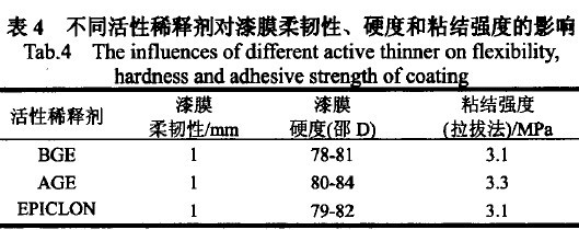 2.6不同活性稀釋劑對(duì)漆膜柔韌性、硬度和粘結(jié)強(qiáng)度的影響通過上述樹脂、固化劑、助劑和顏填料的選擇,我們得出了優(yōu)化后的無溶劑環(huán)氧自流平地坪涂料配方。以此配方為基礎(chǔ),保持其它條件不變,僅改變活性稀釋劑的種類,分別以BGE、AGE、EPICLON 703為活性稀釋劑制備了三個(gè)色漆(A組分),然后,采用NX.2009作為固化劑(B組分)分別制備涂膜,并測(cè)定它們的柔韌性、表面硬度以及與水泥基面的粘結(jié)強(qiáng)度,測(cè)試結(jié)果見表4。