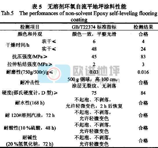 按照優(yōu)化后的配方,采用環(huán)保型活性稀釋劑EPICLON 703制備無溶劑環(huán)氧自流平地坪涂料,并按國(guó)標(biāo)方法檢測(cè)其各項(xiàng)性能,多次重復(fù)試驗(yàn)的測(cè)試結(jié)果重現(xiàn)性好,所制備涂料的各項(xiàng)性能達(dá)到或高于國(guó)標(biāo)規(guī)定的指標(biāo),檢測(cè)結(jié)果見表5。