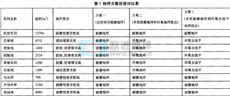 本項目聯(lián)合廠房建筑面積約3.2萬m2,主要包括機加車間、總裝車間、預裝車間、試車間、涂裝車間、后裝車問、毛坯庫、外協(xié)件庫、成品庫等區(qū)域,各區(qū)域地坪方案對比分析如下:(如表I)。