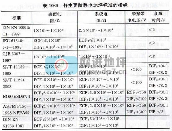 各個國家、各個組織制定防靜電地坪的標準稍有不同,但基本上都是按照地坪的電阻指標來界定的,表為各主要防靜電地坪標準的指標。