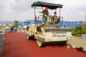 1 彩色瀝青與普通瀝青混合料的拌和基本相似,但應(yīng)著重注意拌和前,應(yīng)將攪拌站的拌和缸和瀝青輸送管道、運(yùn)輸車、施工機(jī)械設(shè)備等清洗干凈,防止色彩干擾。拌缸可用加熱后的粗集料清洗3~4 次,基本就能清干凈了。2 拌和溫度最好控制在160℃~180℃,拌和時間比普通瀝青混合料多10s 左右,在出料口及時檢查粒料顏色是否均勻。嚴(yán)格控制各材料的加熱溫度和出料溫度。過高的溫度會影響混合料色澤,超過190℃的混合料應(yīng)予以廢棄。