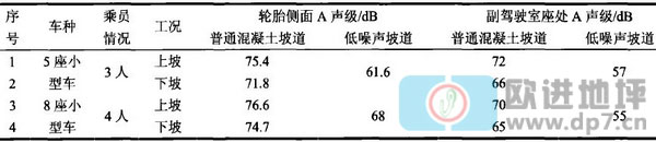 為了確定低噪聲坡道的實際降噪效果,對具有相同坡度的普通水泥坡道和低噪聲坡道處噪聲進行了對比測試。小型轎車從車庫出入口中心線正上方通過,模擬車輛在坡道上行駛。汽車門窗緊閉,檔位為1擋,保持車速約為5-10km/h。設置兩處采樣點:一處為輪胎外側,普通混凝土坡道上的采樣點距車身外側邊線0.6-1.0m,低噪聲坡道上的采樣點距車身外側邊線0.3-0.5m,兩者均高出路面15cm;另一處為副駕駛室座上方。用VS302USB雙通道聲信號分析儀進行噪聲采樣,并計算各種情況下采樣噪聲的總A聲級。低噪聲坡道與普通混凝土坡道噪聲對比測試結果見表1。由表1可知,與普通水泥坡道相比,當車內(nèi)乘員為3~4人時,上坡狀態(tài)下低噪聲坡道上輪胎外側測點降噪量超過8.sdB,下坡狀態(tài)下的降噪量超過6.sdB。上坡狀態(tài)下駕駛室內(nèi)測點降噪量為15dB,下坡狀態(tài)下的降噪量為gdB。