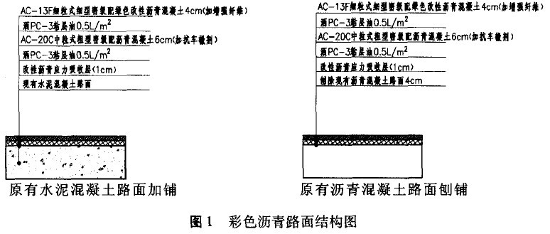 隨著“公交優(yōu)先”發(fā)展戰(zhàn)略的持續(xù)推進(jìn),彩色瀝青在我國的應(yīng)用已從單純的景觀鋪裝進(jìn)入可以起到強(qiáng)烈的區(qū)劃、警示作用的“公交優(yōu)先車道”階段。廣州首次在中山大道公交系統(tǒng)(BRT)試驗(yàn)線工程中采用了綠色瀝青公交專用道,設(shè)計路面結(jié)構(gòu)形式為:原有水泥混凝土路面加鋪兩層瀝青面層、原有瀝青混凝土路面先刨除4cm瀝青混凝土再加鋪兩層瀝青面層,如圖所示。上面層彩色瀝青為AC一13F細(xì)粒式細(xì)型密級配綠色改性瀝青混凝土(加增強(qiáng)纖維)。