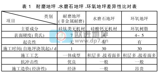 工業(yè)彩色耐磨地坪的施工采用機(jī)械化施工,并且施工時(shí)要和基層混凝土澆筑同步進(jìn)行,與其他地坪相比,可大幅度縮短工期,避免了水磨石地坪施工時(shí)出現(xiàn)的泥漿、污水污染現(xiàn)象,且具有耐磨性好,不起塵;硬度高,可重載;表面致密防滲透;成本低的特點(diǎn)。