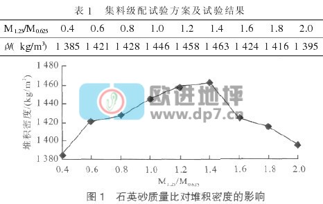 集料的級配對材料的強度、工作性、耐久性有著較大的影響,將兩種粒級石英砂以不同質(zhì)量比(M1.25/M0.625)進行混合,測試其堆積密度(ρ'),并選擇最大堆積密度所對應的比例對兩種粒級石英砂進行摻配,可使地坪硬化劑在固定膠凝材料用量的基礎上盡量致密并減少干縮。試驗結果見表1。如圖1所示,混合后的集料堆積密度隨M1.25/M0.625的變化而呈拋物線規(guī)律變化,其最大點位于M1.25/M0.625為1.4處,最大堆積密度為1 463 kg/m3。