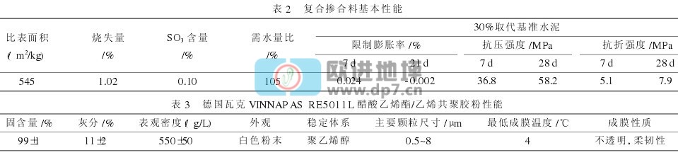水泥砂漿中摻入超細粉煤灰和礦渣微粉,不僅可以提高砂漿的綜合性能,而且有著積極的社會效益。單摻粉煤灰使砂漿的早期強度明顯下降,但后期強度有較大增長,甚至超過不摻粉煤灰的砂漿。礦粉單獨使用時,對早期強度影響不大,后期強度有很好的增長,但摻入礦粉后,砂漿的自收縮有可能增大,礦粉越細,自收縮越大。將粉煤灰和礦粉復合混磨,可以獲得對砂漿性能的有效改善,而且粉煤灰和礦粉的二次水化作用物理填充作用可以提高砂漿的密實度,同時可彌補由于單摻聚合物膠粉所導致的強度下降[2]。天然硅灰石粉具有較好的纖維形態(tài),有研究表明一定摻量的硅灰石粉可提高水泥膠砂試件的抗折強度[3]。另外,考慮到上述材料的添加有可能使干粉砂漿的收縮增加,為此在復合摻合料中摻入膨脹組分。將粉煤灰、礦渣粉、天然硅灰石粉及膨脹組分進行混磨,過篩,形成復合摻合料,其性能見表2。
