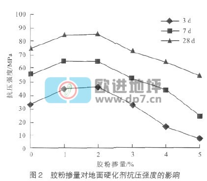 (1)如圖2所示,隨膠粉摻量的增加,地面硬化劑各齡期抗壓強度變化趨熱大致相同,抗壓強度有上升階段,隨后下降。當膠粉摻量為1%、2%時,28d抗壓強度可提高12.3%~14.2%,可以認為復合添加劑中的減水組分抑制了由于膠粉的高需水量對強度所形成的不利作用,同時復合摻合料中微粉效應及二次水化效應可增加材料的也對強度的增長起到了積極的作用。當膠粉摻量為3%、4%、5%時,抗壓強度逐漸下降,甚至低于空白試件,此時在復合添加劑其它組分不變的情況下,膠粉的需水量造成水灰比增大,與其抑制水化的性能共同作用下,使抗壓強度明顯下降。