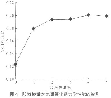 (3)如圖4所示,28d折壓比隨膠粉摻量的增加呈上升趨勢,當膠粉摻量為1%、2%時折壓比快速增長,超過3%的摻量時,折壓比增長緩慢,折壓比可提高64.5%。可以認為適當摻量的膠粉可明顯地改善地面硬化劑的韌性。