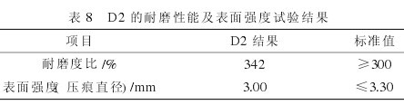 根據(jù)上述試驗,以D2的配合比進行耐磨性能及表面強度試驗,按JC/T 906—2002《混凝土地面用水泥基耐磨材料》中規(guī)定進行,測試結果見表8。