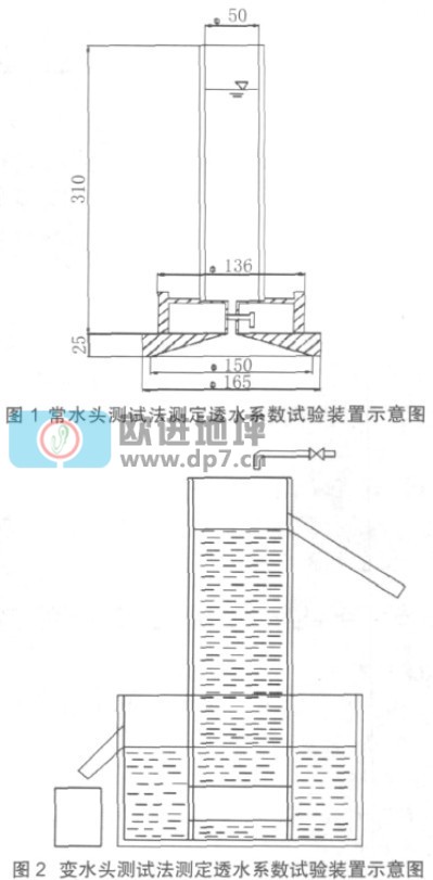 目前,檢測透水性材料滲透性的方法通常有兩種:常水頭測試法[11(] 見圖1)和變水頭測試法[12](見圖2)。一般常水頭測試法適用滲透性大的滲透材料測試;變水頭測試法適用滲透性小或非滲透性材料測試。同時,兩種方法均在材料受到承壓水的前提下進行滲透試驗。