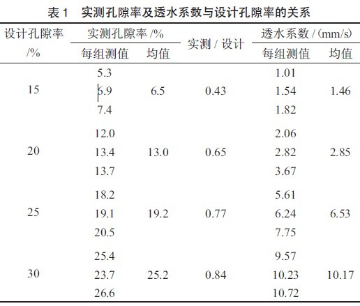 試驗(yàn)采用粒徑為10~20 mm 的碎石,設(shè)計(jì)透水混凝土的孔隙率為15%、20%、25%和30%時(shí),研究設(shè)計(jì)孔隙率、實(shí)測(cè)孔隙率與透水系數(shù)的關(guān)系,試驗(yàn)結(jié)果見表1 及圖1。