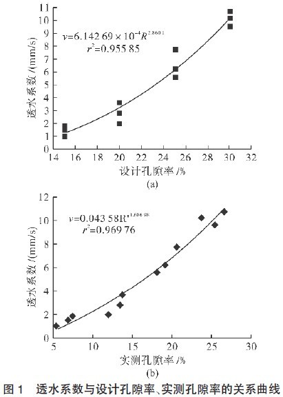 由于進(jìn)行透水混凝土的配合比設(shè)計(jì)時(shí),透水系數(shù)并不能直接通過配合比設(shè)計(jì)確定。雖然孔隙率是反映透水混凝土透水系數(shù)的一個(gè)重要指標(biāo),但孔隙率與透水系數(shù)并不存在對(duì)等關(guān)系,其他一些因素比如孔隙的特征、大小及孔隙的路徑走向等,對(duì)透水混凝土的透水性能也有著不可忽略的影響。因此,探討孔隙率與透水系數(shù)的關(guān)系對(duì)透水混凝土配合比設(shè)計(jì)具有重要意義。