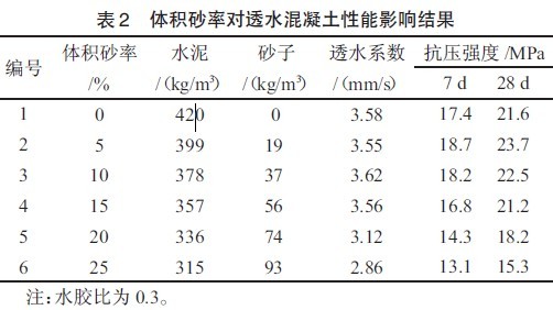 由表2 中可知,體積砂率在0~15%范圍內(nèi)透水系數(shù)變化較小,當(dāng)體積砂率超過15%時(shí),透水系數(shù)明顯下降。這主要是因?yàn)椋谂浜媳仍O(shè)計(jì)中,砂子等體積取代水泥,透水混凝土的孔隙率保持不變,因此其透水系數(shù)隨著體積砂率的變化較??;但體積砂率超過一定值后,由于骨料的級(jí)配得到改善且砂子堵塞透水混凝土孔隙的幾率增大,從而導(dǎo)致透水系數(shù)下降。