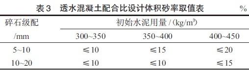 由試驗(yàn)結(jié)果可知,“體積砂率”對(duì)透水混凝土的強(qiáng)度具有重要的影響,在透水混凝土的配合比設(shè)計(jì)中引入“體積砂率”這一參數(shù),對(duì)透水混凝土中摻用砂子時(shí)配合比設(shè)計(jì)具有重要的指導(dǎo)意義。本試驗(yàn)中最佳體積砂率為5%,且體積砂率不宜超過15%。對(duì)于不同的水泥用量及石子級(jí)配,體積砂率的取值不同,表3 給出了經(jīng)過試驗(yàn)研究得到的砂率取值表。