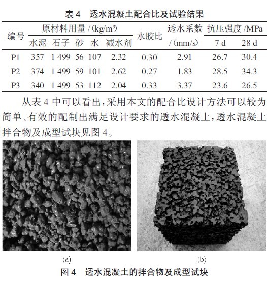 (6)另選擇0.27、0.33 兩個(gè)水膠比,按照上述步驟進(jìn)行配合比設(shè)計(jì),透水混凝土配合比及試驗(yàn)結(jié)果見表4。