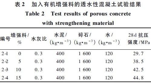在編號1-4 配合比的基礎上,分別加入水泥用量5%,10%, 15% 的標美彩石產(chǎn)著色增強料,以了解透水混凝土強度的變化。試驗結果如表2 所示。